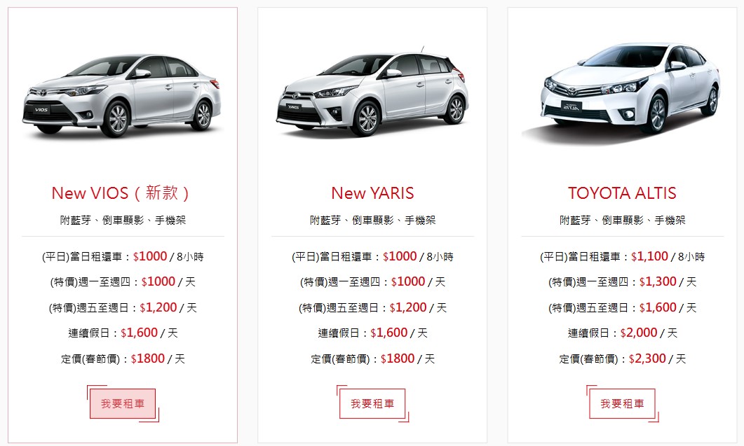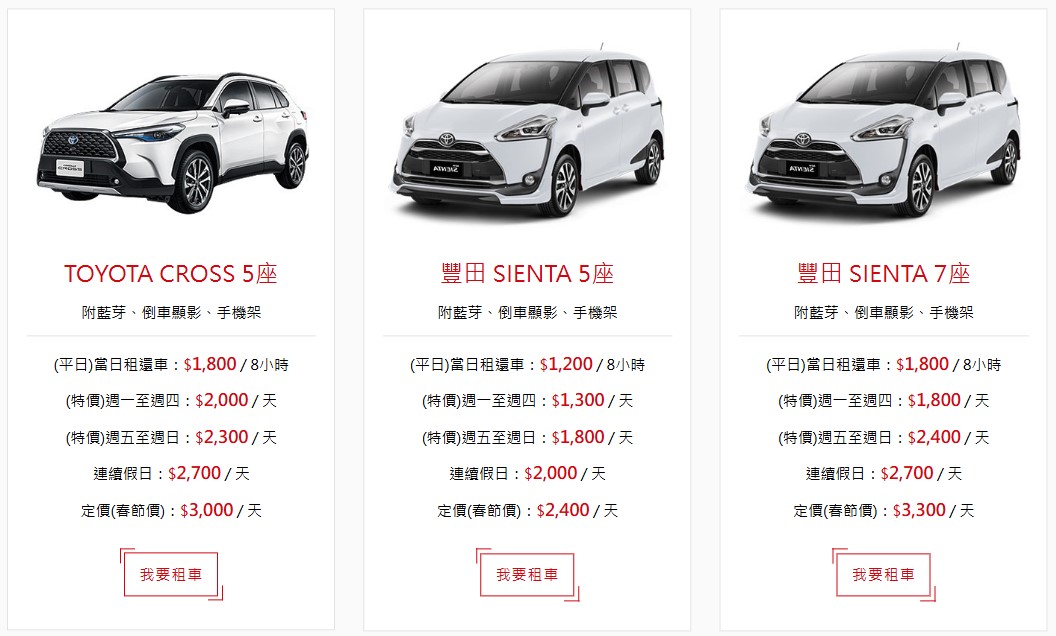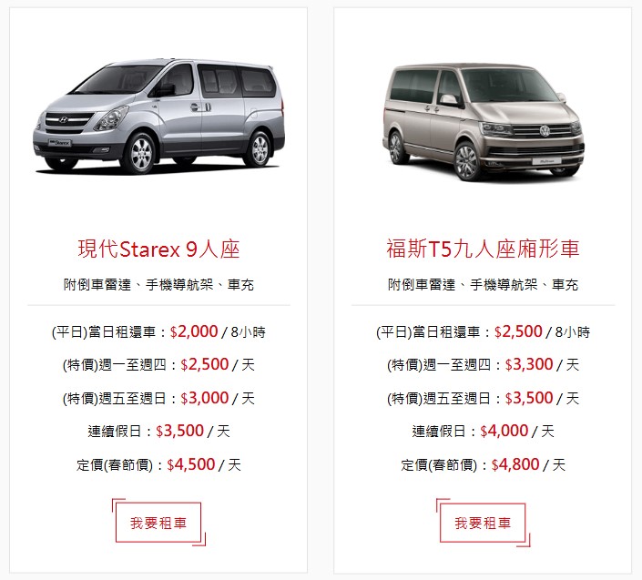 若須租車請洽詢櫃台人員提早為貴賓預訂車款。
